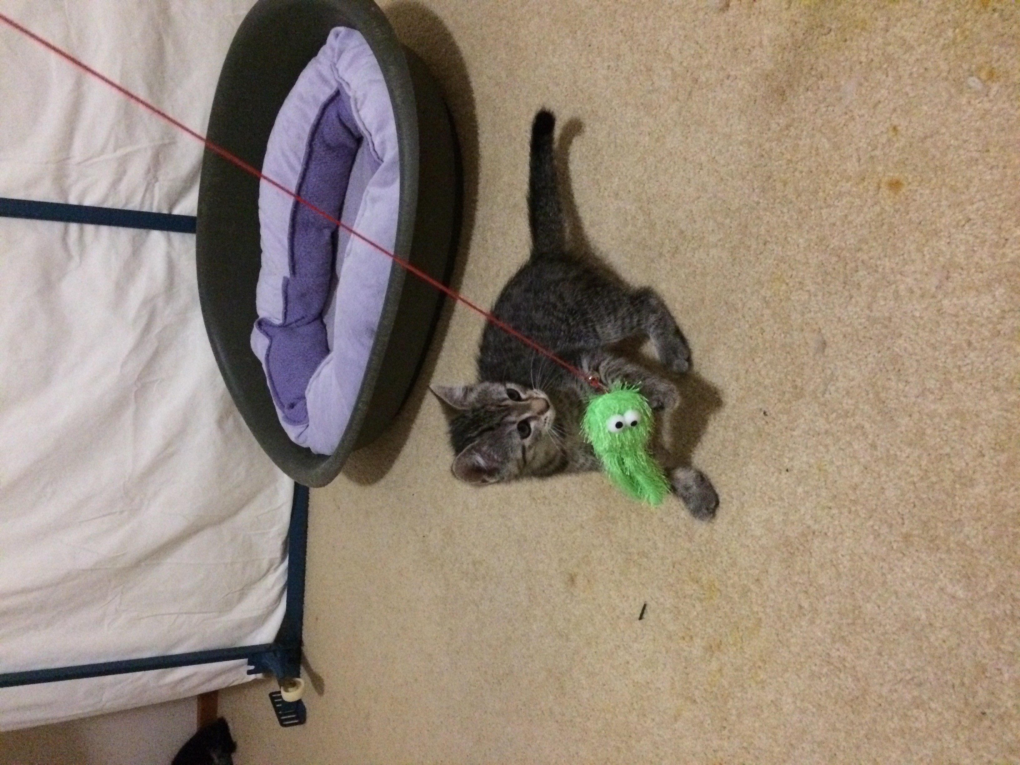 Spike is a very lively and playful kitten who loves to pounce on toys on a string. We recommend her for a household that wants an active and playful kitty, where she will be given lots of toys and a climbing tree.