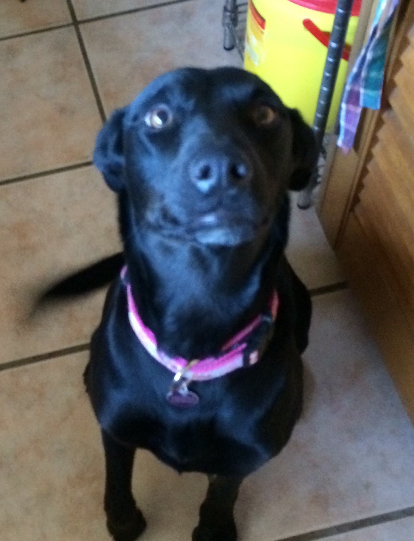 Cleo is fascinated by cats, and will just sit and stare at them for ages. She would be better in a cat-free home, to avoid creeping out a cat!