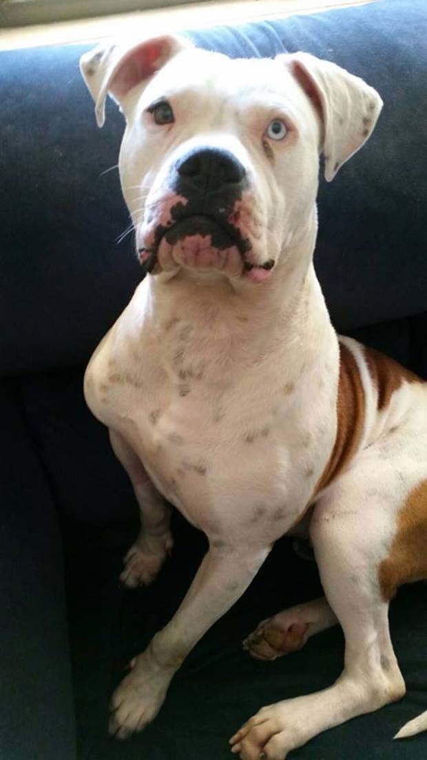 Bluey came into care with a big heavy chain and two pressure sores on his hind, suspect from being confined on a too small space. You wouldn’t know it personality wise, as he's well adjusted, very friendly good with everything even the vacuum and storms.