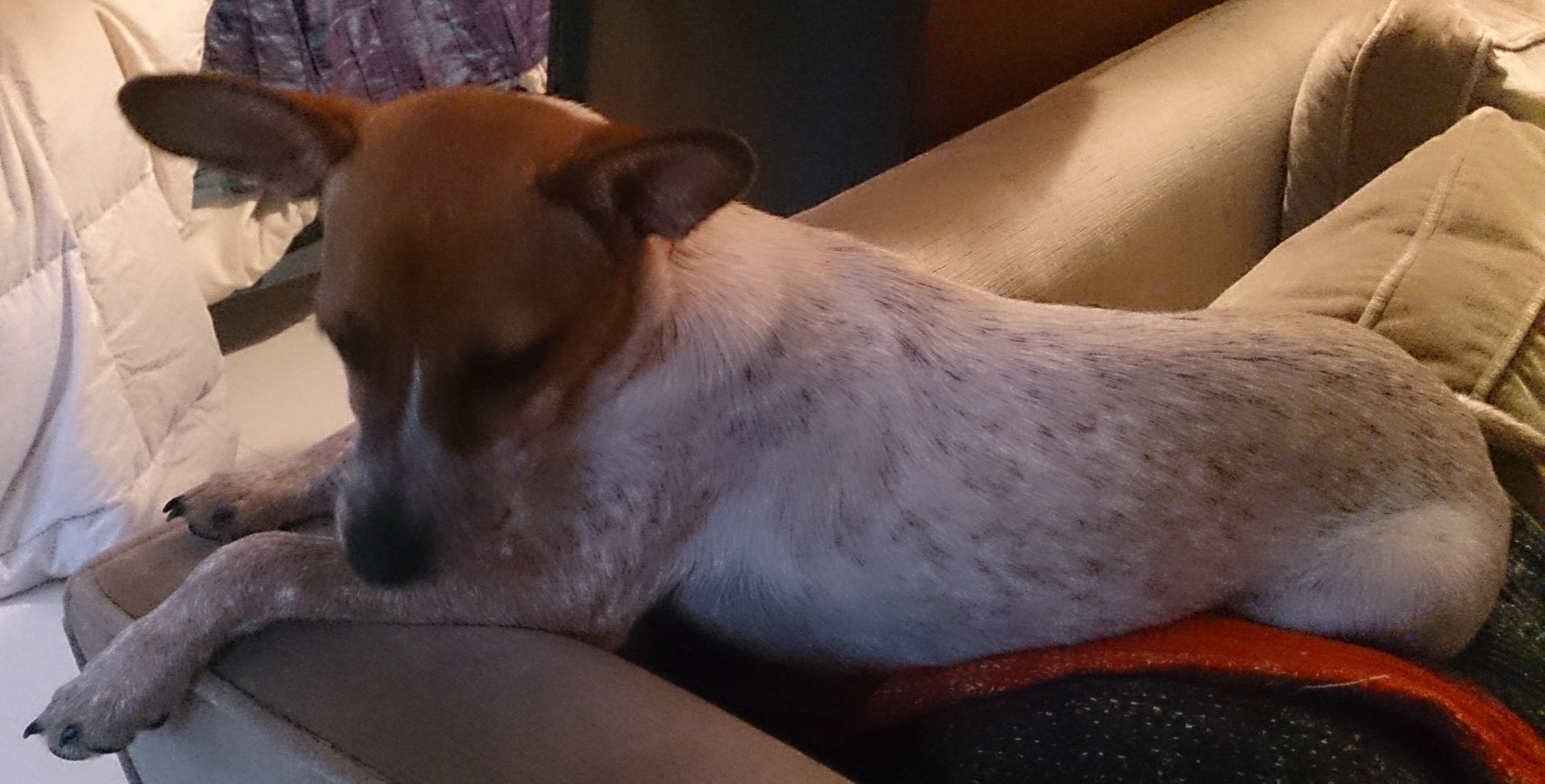 Her very slim shape reminded the vet of whippet, her pointy face of a Chihuahua and huge ears perhaps from a kelpie. She stands approx. 40cm high. So we have no idea of her breed just that she is a very gentle dog.