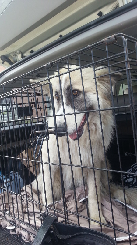 She has a lovely soft coat and beautiful markings. We have just taken a guess at her breed - she has a German Shepherd-like silhouette from the side, a long slender snout like Lassie, Australian Shepherd type markings and a Border Collie textured coat.