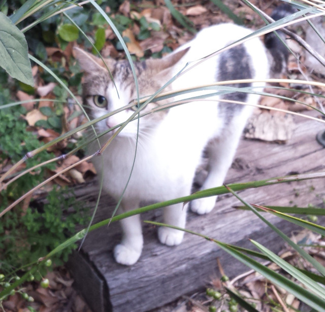 She currently lives in a foster home with dogs, children and other cats. She copes with us all. She is neat and tidy with a kitty litter tray. She sleeps inside but happily explores the garden outside during the day. She responds to her name and comes when you call.