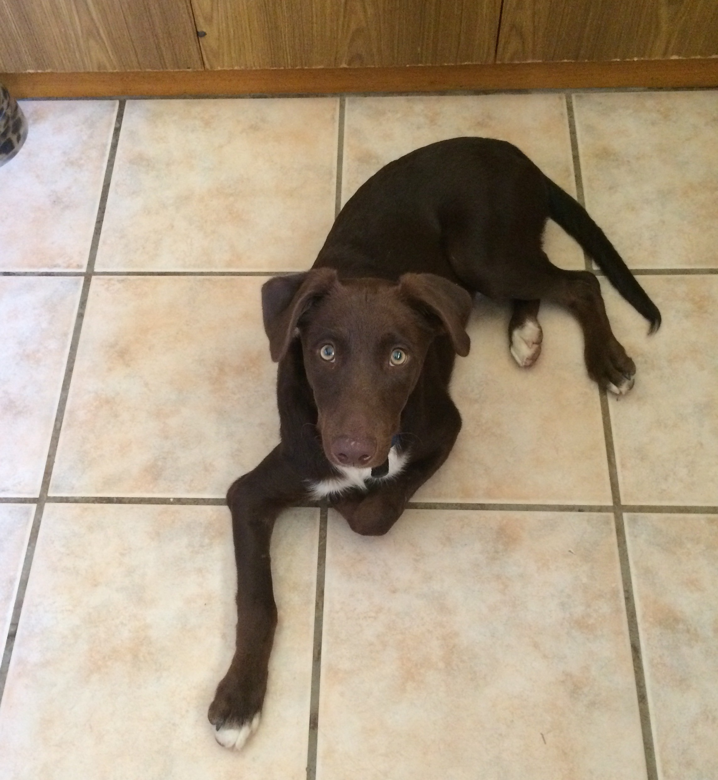 Rusty is a handsome dark chocolate/red dog who is friendly and sociable to all he meets. Rusty is quiet-natured for a kelpie pup, doesn't demonstrate any of the "working dog drive" or high energy, and he is housetrained to use a flap door to take himself outside to toilet. He is quite the faithful shadow when someone is home, preferring to hang about nearby to wherever you are working, whether in the garden or in the kitchen. Left to himself, he likes to chew toys in the yard or just doze in the shade.