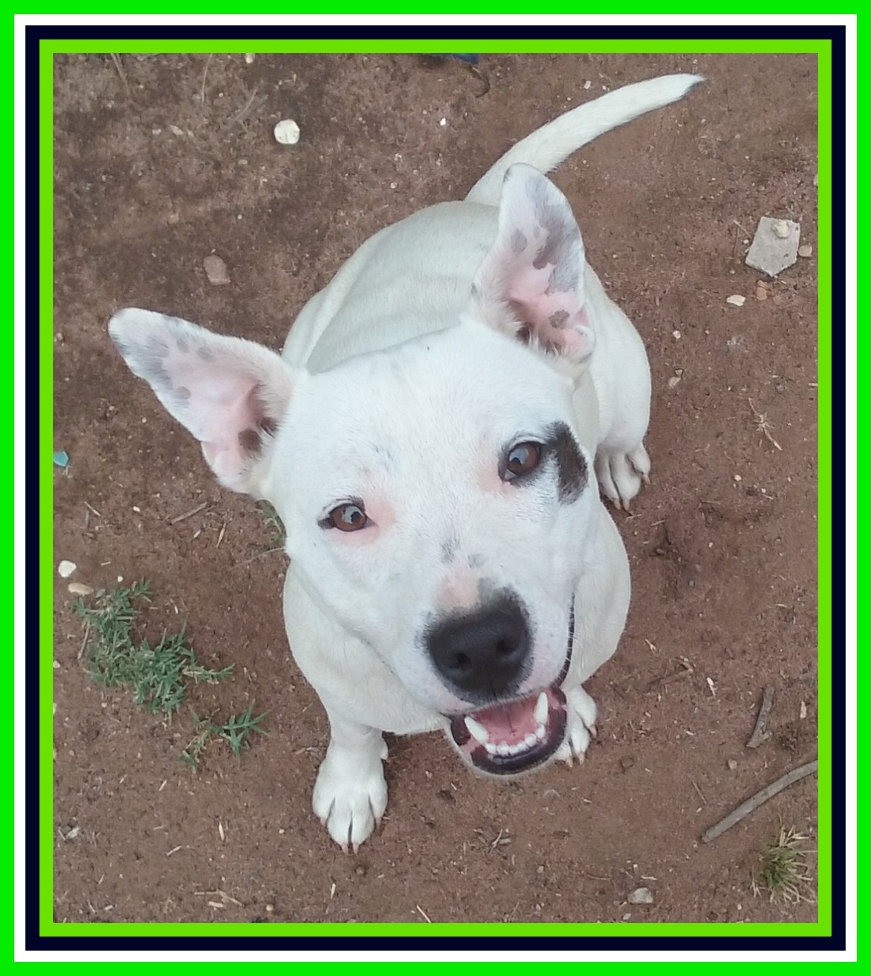 Rescued from a country pound Mae walks well on the lead and travels well in the car. She doesnt make the usual staffy whine but does do the occasional little trill of sound like she is talking to you. When caged or separated from the action she is quiet and doesnt complain. She rarely barks and seems to want to be inside but not tested for housetraining as yet.