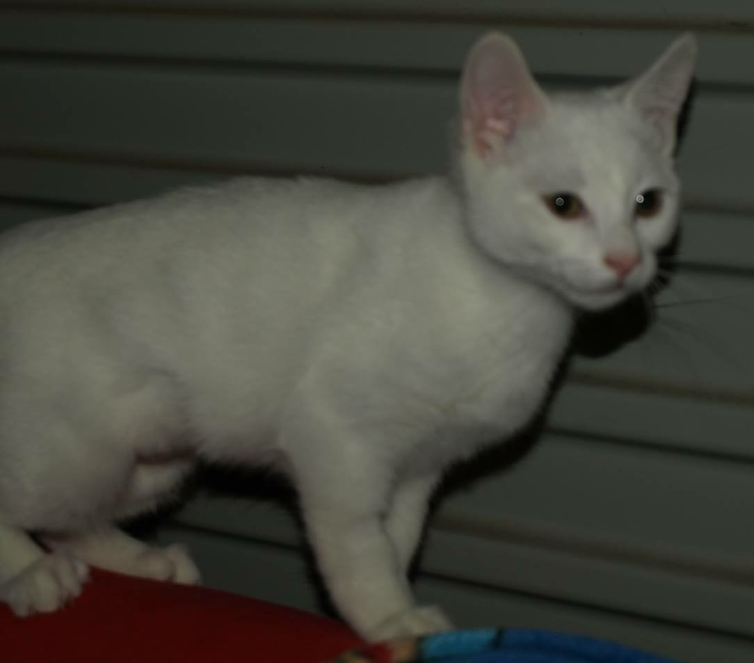 Curlea is a fun kitten. She loves to play with her siblings and has been well socialised with other cats. She also likes to play with toys - soft ones are her favourite. Curlea was born in care and has turned into a lovely kitten. She has been in care with young children and is good with them (she is very gentle). Curlea likes to run through the cat tunnel and play with her rescue friends and is usually the instigator of mischief. She can be a ratbag but you could spend hours watching her play. Curlae prefers to not be held but will come to you when she is ready for a pat, and she is more comfortable sleeping next to you rather than on top of you. Sometimes she snores when she sleeps and she is more than happy to be your alarm clock. Curlaes tongue is almost always poking out just a little, which makes her even more cute and unique. Curlae is a tad apprehensive when meeting strangers but once she works out they’re ok she is fine. She is litter trained and not fussy with her food (eats wet or dry and loves kitten milk). Curlae is an inside only cat - due to being white there is a high risk of skin cancer.