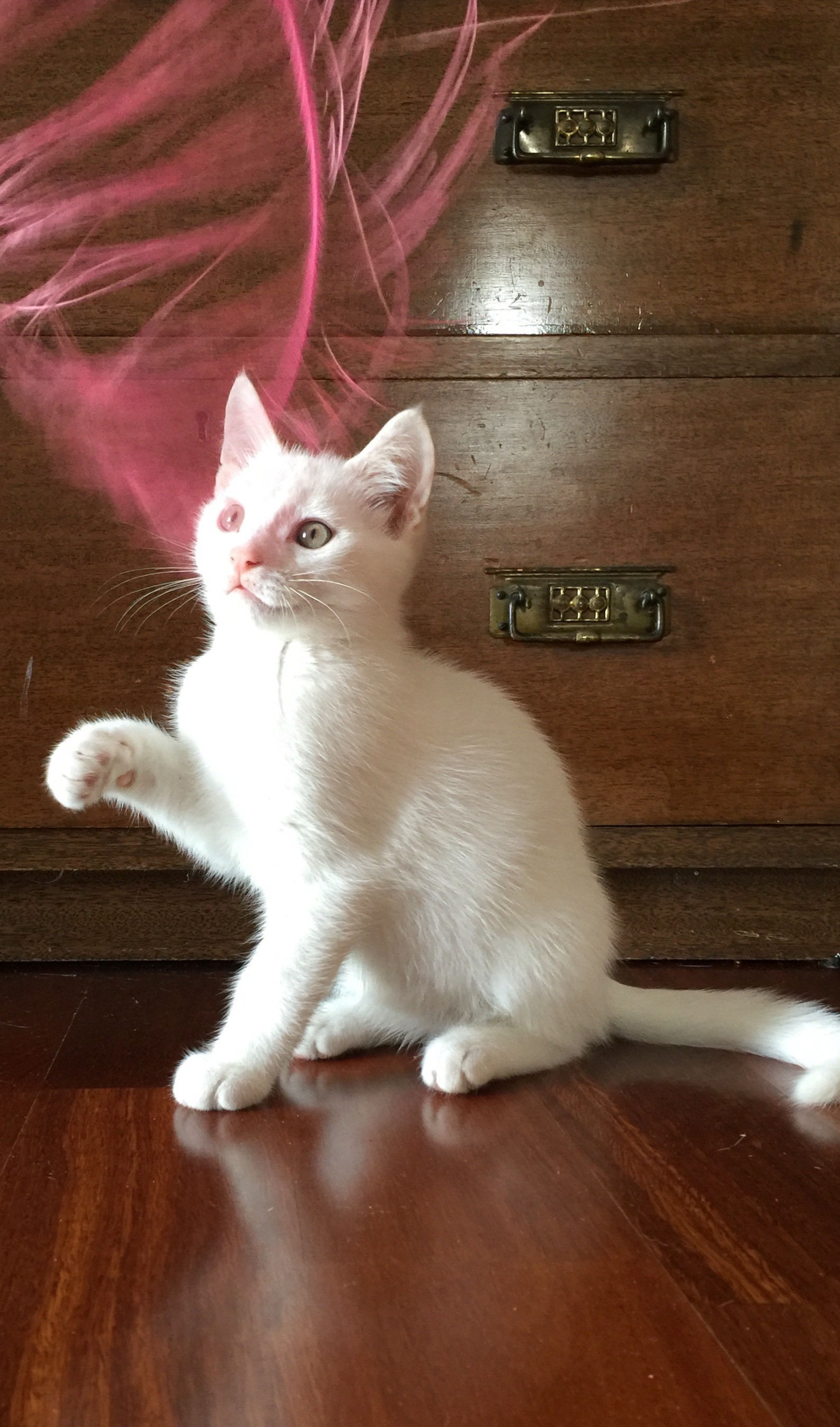 Marshmallow is a stunning pure white boy. He's can't wait to play with you and will follow you around and throw himself at your feet for a tummy rub or join you in bed for a cuddle. Best suited to a quiet house with another cat with/without older children ***Marshmallow will only adopted to a strictly indoor household due to his colouring. Please visit our website and fill out the online application form at www.innercitystrays.com