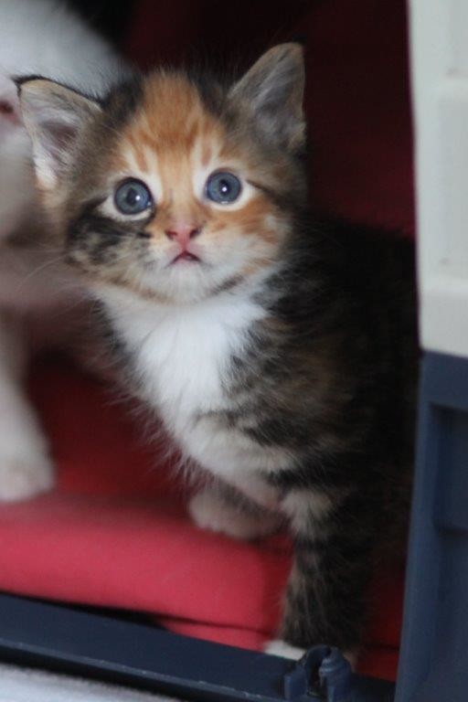 She gets on well with her siblings even though she is the only girl and the smallest of the litter, she keeps her big brothers under control. She gets on with all her human family as well as all the other cats of the household. She loves her food and is not at all fussy but she is definitely looking forward to not having to share her food with three hungry brothers.