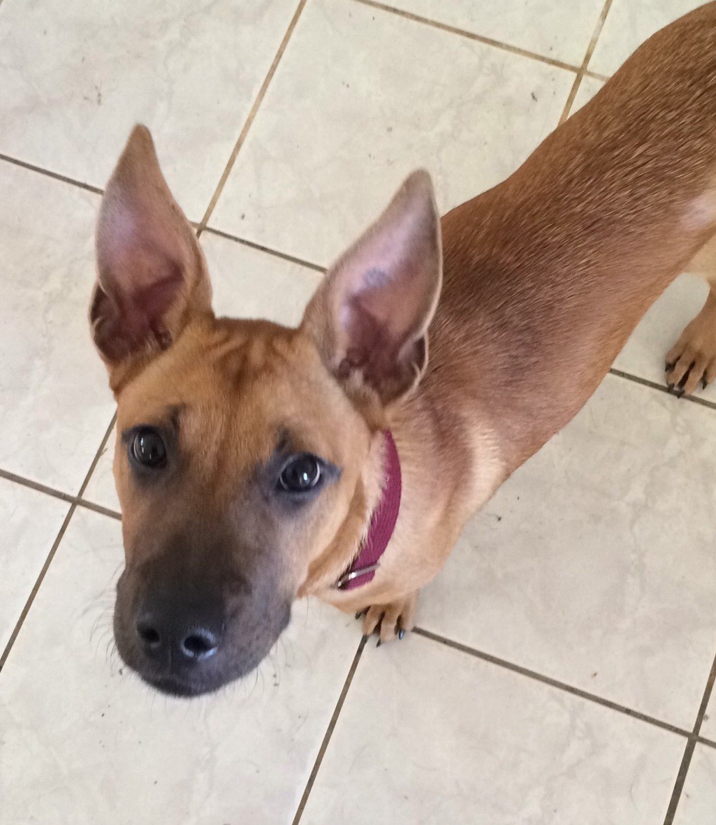 She is incredibly smart - she's learned sit, down and wait (somewhat) already and is already learning to walk on lead. She rarely jumps up and will zoom up to you and sit to be tickled.