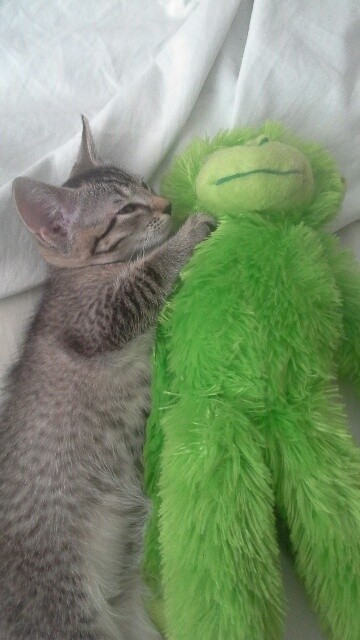 Betsy is an absolute sweetheart and so pretty with her stunning markings - she is very affectionate and always rolls over for tummy rubs. She loves being tickled & brushed and for a dainty little girl, she has a very loud purr. She has a green monkey soft toy that she just loves and she either drags it around as if she is a lioness or she falls asleep cuddling it :-)