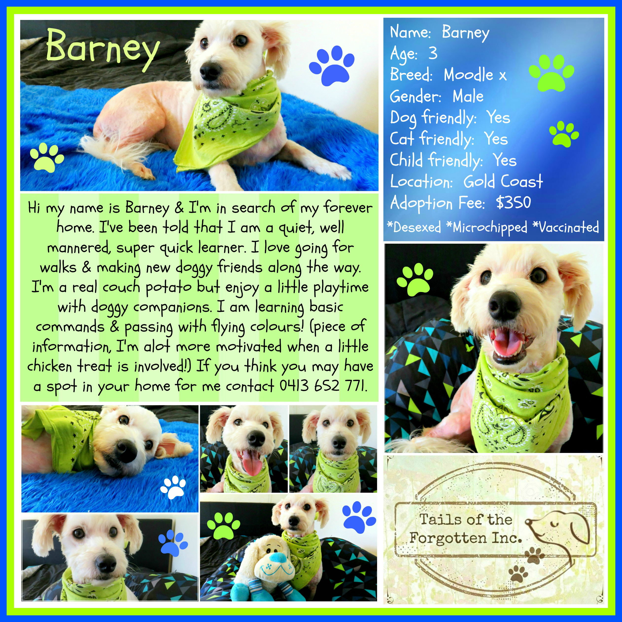 Hi my name is Barney and I'm in search of my forever home. I've been told that I am a quiet, well mannered, super quick learner. I love going for walks and making new doggy friends along the way. I'm a real couch potato but enjoy a little play time with doggy companions. I'm learning basic commands and passing with flying colours! (Piece of information.. I'm a lot more motivated when a little chicken treat is involved!)