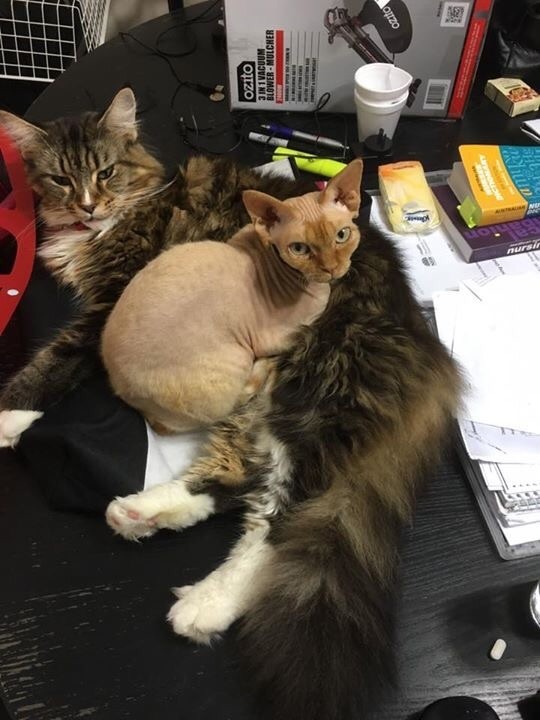Meet Peanut a 4 1/2 year old Mainecoon and Shelbee a 3 1/2 year old Devon Rex.