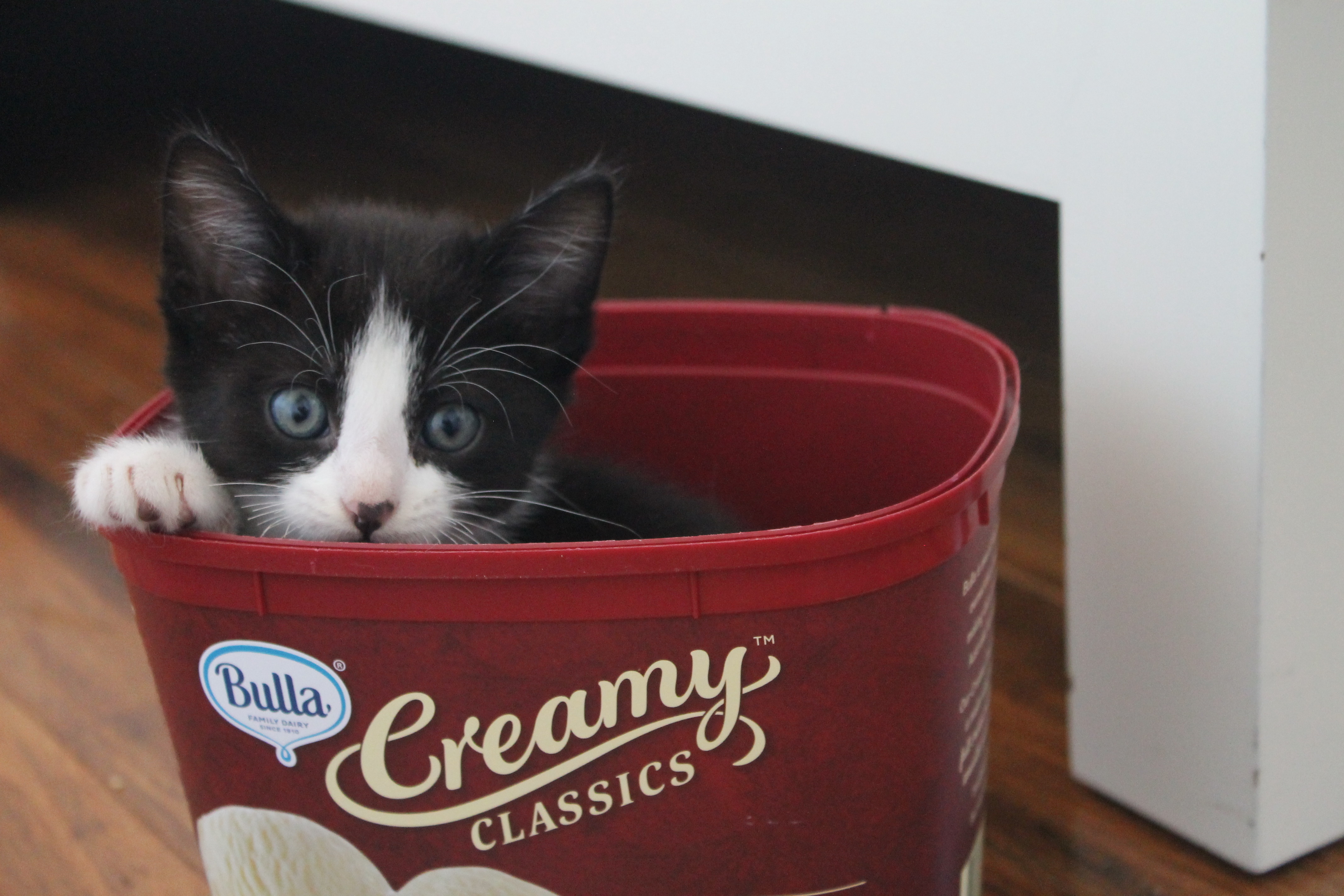 Taystee hasn’t got a bobtail like her mum, but she has a little goatee spot on her chin. It looks like she always has a piece of tasty food saved for later. She looks like a tiny version of her brother Larry; black with white paws, face and stomach.