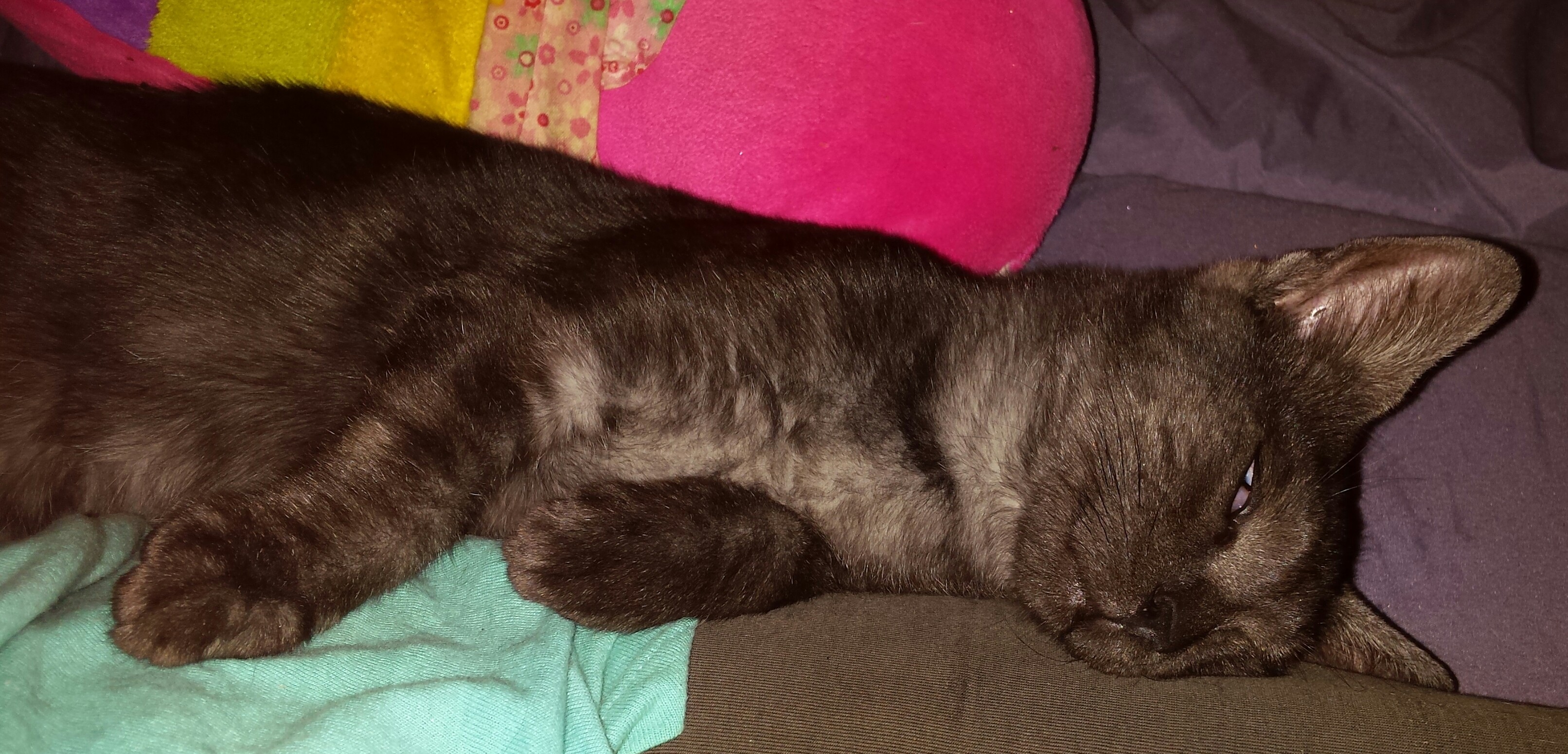 Little romeo Jamal is a delightful little man - a lovely companion and fun little guy :-) His chocolate tabby coat is positively gorgeous with its white roots and he loves to curl up with you on the lounge or sprawl across you for afternoon naps :-) He'll purr away and suckle on anything - blankets, pillows, dressing gowns, you name it! The moment you sit down, he's there! Perfect just in time for winter ;-)