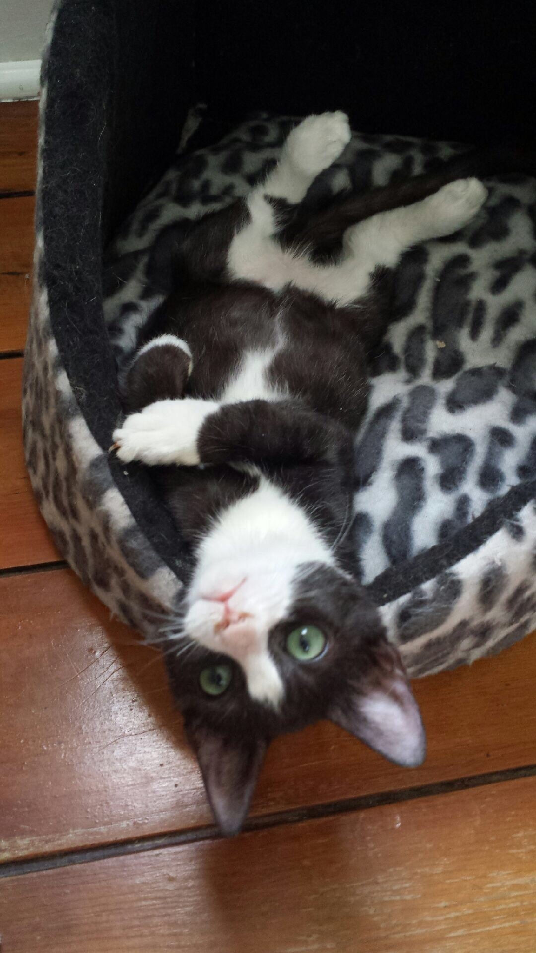 Bandit is a massive couch potato! She loves a nice snooze in a warm bed and spends most of her time sprawled out, lying upside down. She gets up to play and explore for a little while, but it doesn't take long until she is over it and back in bed. When she first came into care she was very unwell, but after a lot of TLC, she is feeling so much better and her funny little personality is really starting to shine. She loves following you around the house and will gently scratch at your shoes to be picked up. She has the most adorable little face, she will stare at you constantly with those massive eyes. What makes her even cuter is her round belly and short, stumpy legs (this also means she can't run very fast). She loves pats - she pushes her head up into your hand with every pat. She is also used to being picked up constantly for cuddles and puts up with being kissed all over her beautiful little face (this is tested daily). She prefers to play with her human - whether it is attacking your hand or playing gently with a toy that you throw around for her. She is just so chilled out and loving and oh so adorable!!! She loves other (gentle) cats (she isn't very good at defending herself or running away) and is good with dogs. She isn't confident with stairs at all, so a house with stairs isn't suitable for her.