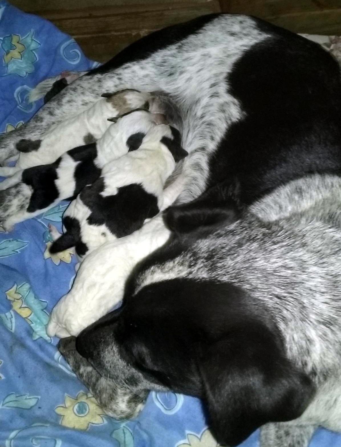 Mum Teal is an excellent mother, shows no aggression at all to her pups. She feeds and plays with her puppies, as well as cleaning them when they need it and sharing solids with them without any issues. Teal adores people and her loving nature is evident in her pups.