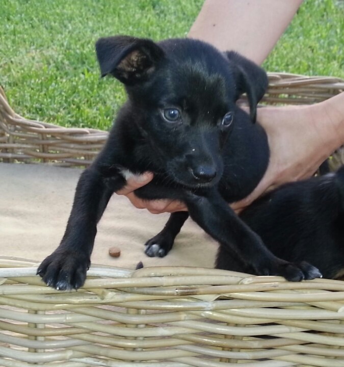 With a shiny, soft black coat, Dixie will grow into a lovely dog. She has the cutest ears too.