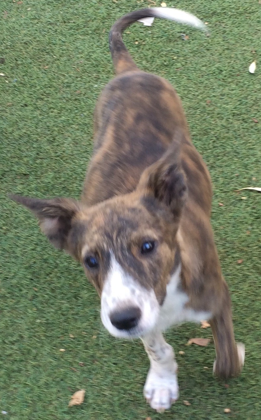 With her tall ears, slim build and colouring we guess she will reach the size of a kelpie. Perhaps the brindle colour suggests a touch of staffy and the spots cattle dog. This is just a guess as we have no idea who her parents were.