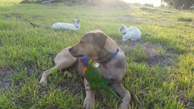 Baker absolutely loves to play and can look like he is charging at the other animals but he is just having fun and there is never any aggression displayed. He is learning what to do with toys – he hates squeaky ones and is still not interested in chasing a ball – his focus is on his humans or his other animal friends. Baker is very bright and learns quickly – he loves to please and be praised so positive training is well received. He now sits, waits for his food and eats on invitation. Baker feeds well with all other species, often sharing his bowl with cats, a Lorikeet or kangaroo – he also really enjoys to chew a bone.