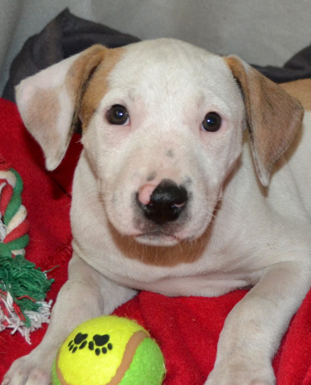 Sally will need to go to puppy school to learn manners and how to grow up to be a well-adapted adult dog. Sally came into care with her mum and siblings at less than 12 hours old so is very affectionate with people. Sally's mum is a 26kg staffy x, we expect Sally to grow to roughly the same size. Dad's breed is unknown.