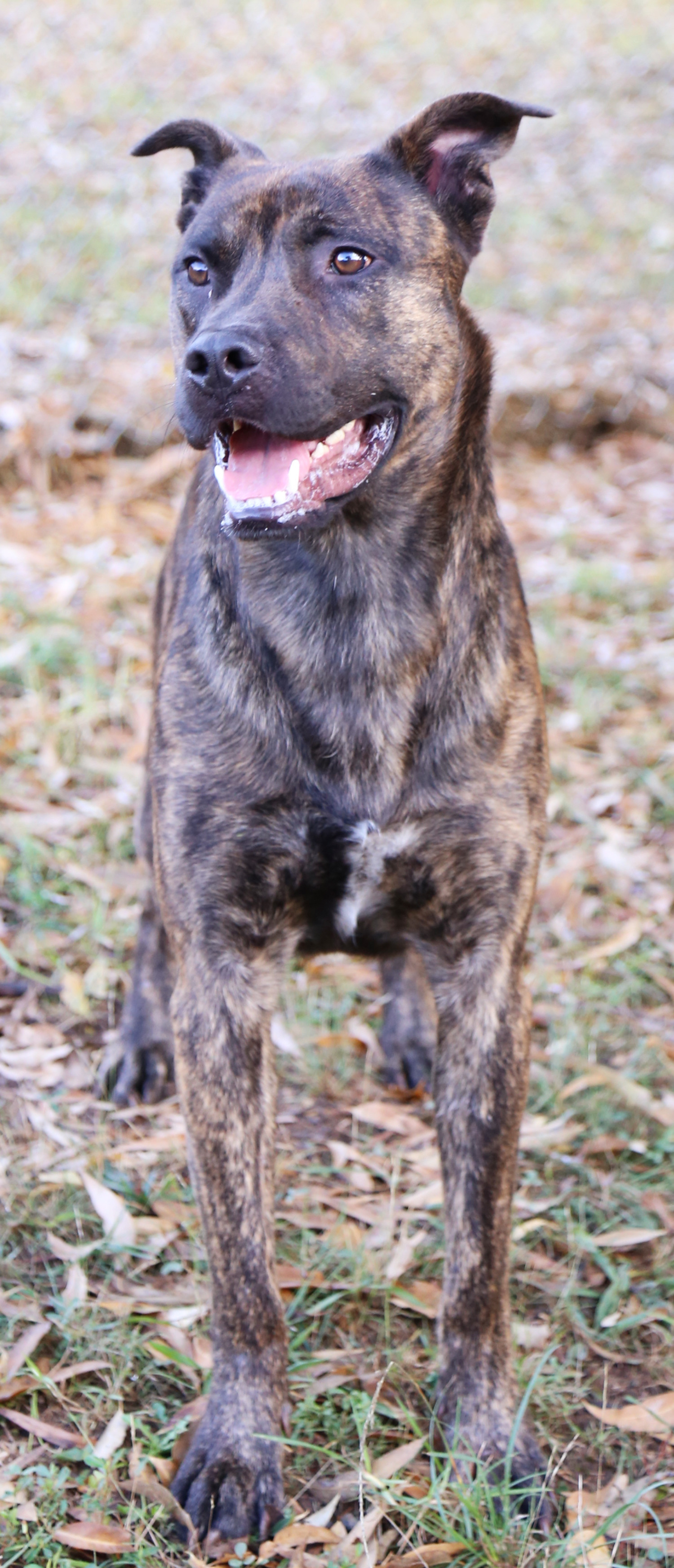 I'm a big brindle boy with a lush soft coat. I love playing with people and doing zoomies in the yard. Other dogs are pretty cool too and I enjoy saying hello to them all as I walk past their kennels. I also walk rather nicely on lead and know how to sit really well!