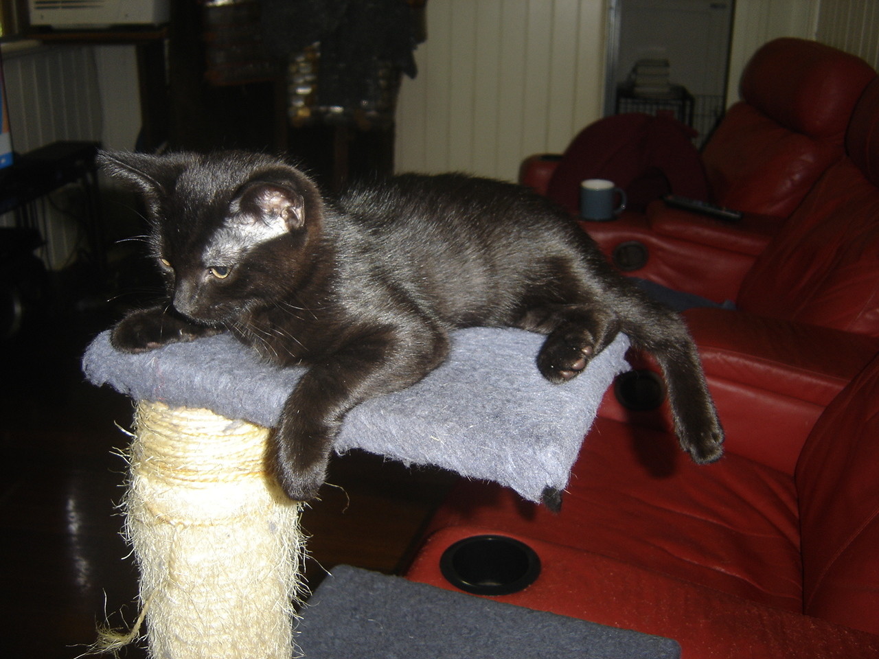 You can tell me apart from other black cats because I have brown eyes. I love a good romp and am happy to play with other kittens and cats once I get to know them. I enjoy playing with cat toys bits of paper dead leaves or anything I find. Curious and adventurous I like to explore...kitchen cupboards are especially fascinating! Haven't had anything to do with dogs yet but might be fine with a dog if we are introduced slowly. I am a charming boy who would make a great companion. I can't wait to meet my new family.