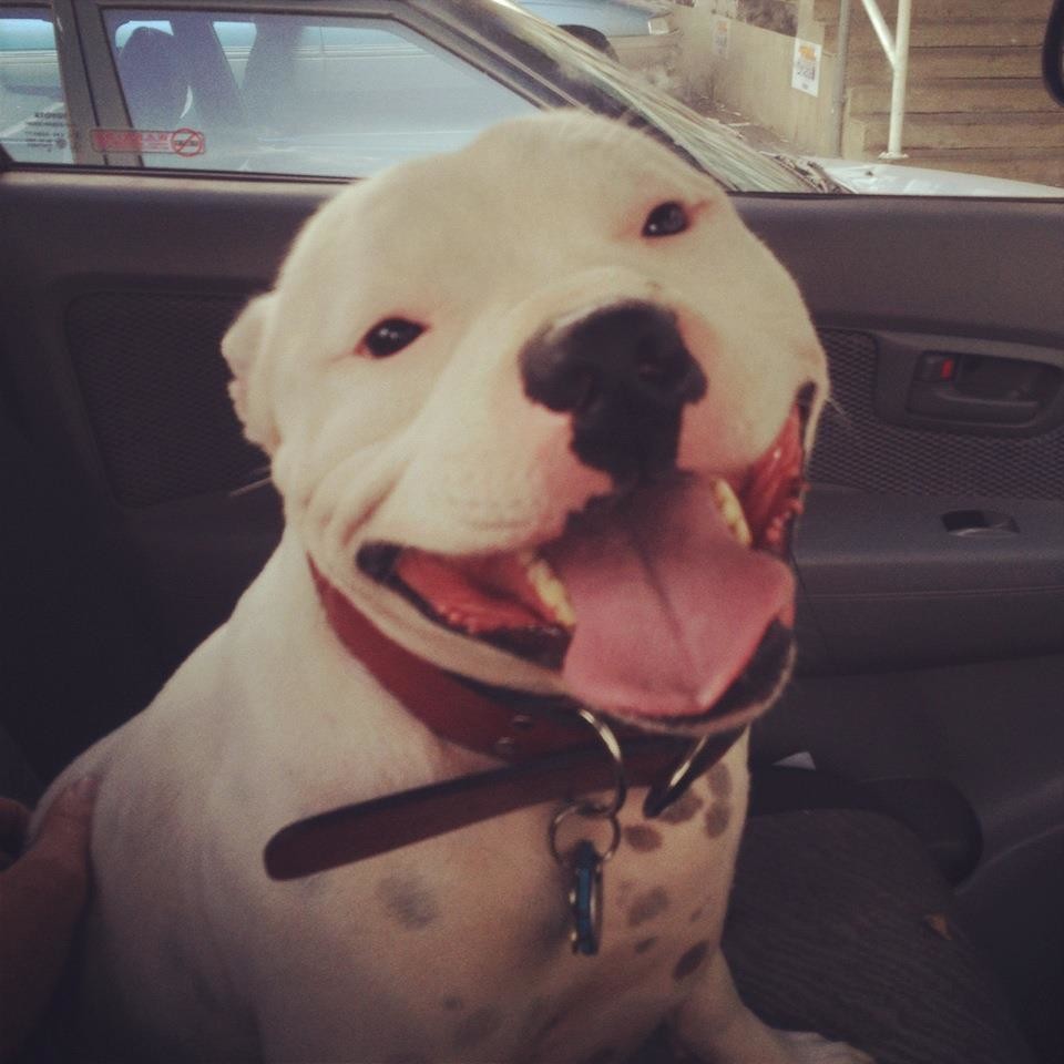 I’m house trained, I love riding in the car, I great with other dogs, I’ve never lived with children but I’m good with them although I could knock little ones over because I jump up, I’ve never lived with a cat so I had best not go to a home with one of those.