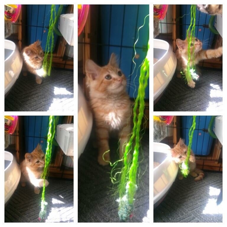 He is such a handsome young man with super soft fur. He enjoys to play, especially with his mouse on a string. He came off the streets with his siblings and he has been enjoying being a spoilt little kitty!