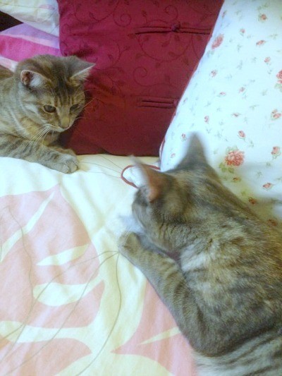 Some people say that Nia is more of a goofball than me but secretly I can be just as goofy! Most of the time we are never far away from the other and we love, like we really LOVE to play both alone, together and of course with our foster Mum. Unlike most other cats we don’t really get excited by balls with sounds but we do love a good game of laser pointer and playing with the more softer toys.. we often carry soft balls/ toys around in our mouths but I promise you that we are cats, we are I promise!