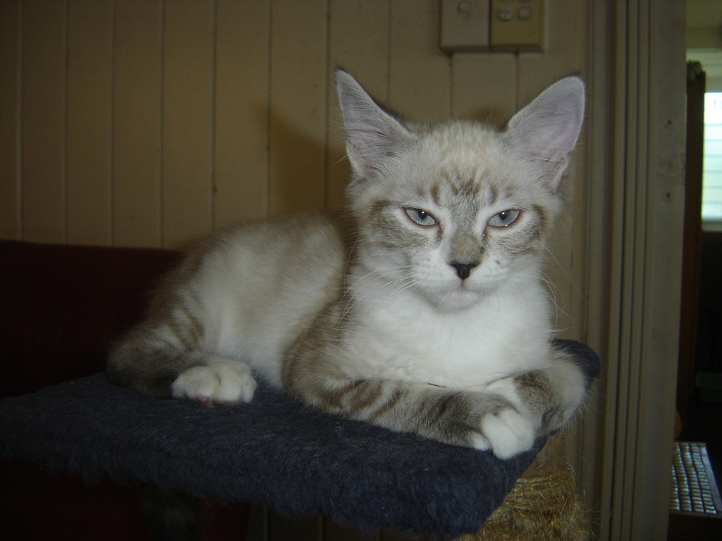 I am a beautiful boy with a lovely nature. I'm not loud or attention seeking but will be the first one to greet you when you get home. An affectionate cat, I adore pats and cuddles. I love to jump or climb onto my carer's shoulders whenever I get the chance. I will knead your neck but it is more like acupuncture than a massage because of my prickly little claws. If I am not chasing toys or bugs, I might have a nap beside the computer while you are working on it. It's best for me to be an indoor only cat because I wouldn't survive the outdoors with my delicate skin and gentle nature. I would love to live in a big house with air-conditioning to keep me cool in summer and windows that I can sit in front of to watch the world outside. I get on well with other cats and enjoy playing with friends. I'm OK with small dogs but hesitant with big dogs until I get to know them. I am so adorable that my foster carer doesn't want to part with me but she can't keep me so I'm looking for a new home and someone to love me. I look forward to meeting my new family.