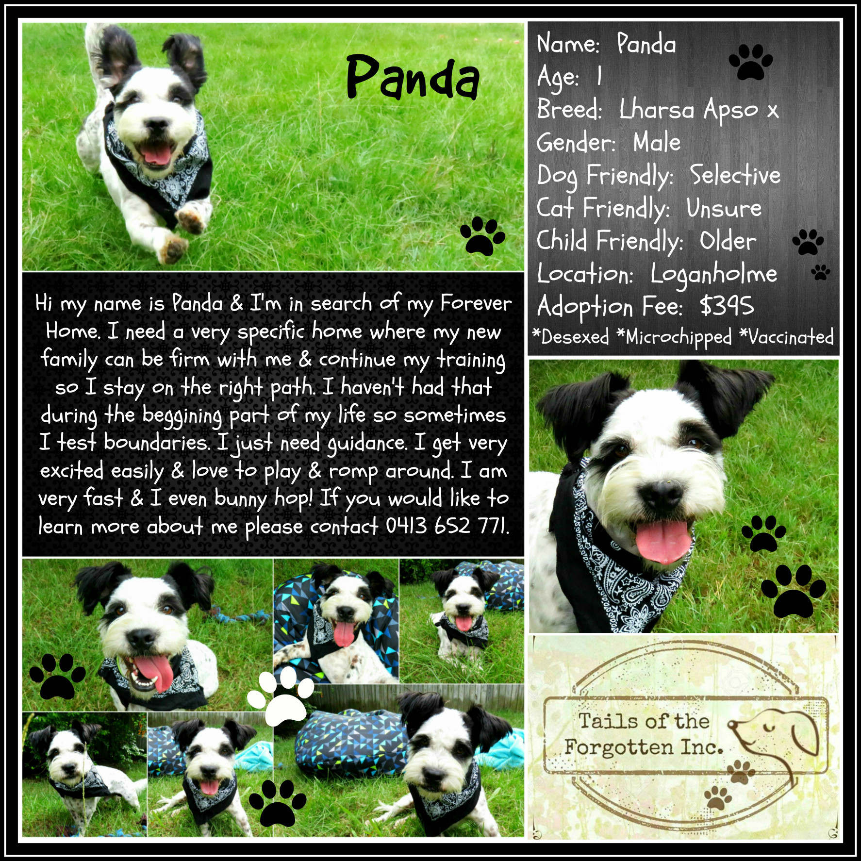 Panda has been in care for a little while now brushing up on some manners & we feel he is now ready to start the quest for his Forever Home. He is looking for a specific home where he can be led with firm guidance and behavioural reinforcement. He has responded extremely well to leadership and has blown us all away with how quickly his attitude has changed significantly. He has lived the first year of his life as the boss and alpha of the house and once the reality check boot camp started at Tails of the Forgotten Inc, all trace of his original attitude dissapeared immediately. He has transformed into a loving dog who is now greatly appreciating what it feels like to feel a tummy rub, have his hair brushed and enjoy the simple, yet special moments in life. His knew family must be able to keep up with the leadership so he doesn't have a chance at falling back into his old ways. Overall he is an absolute sweetheart with unlimited kisses and we know the right family is out there for him!