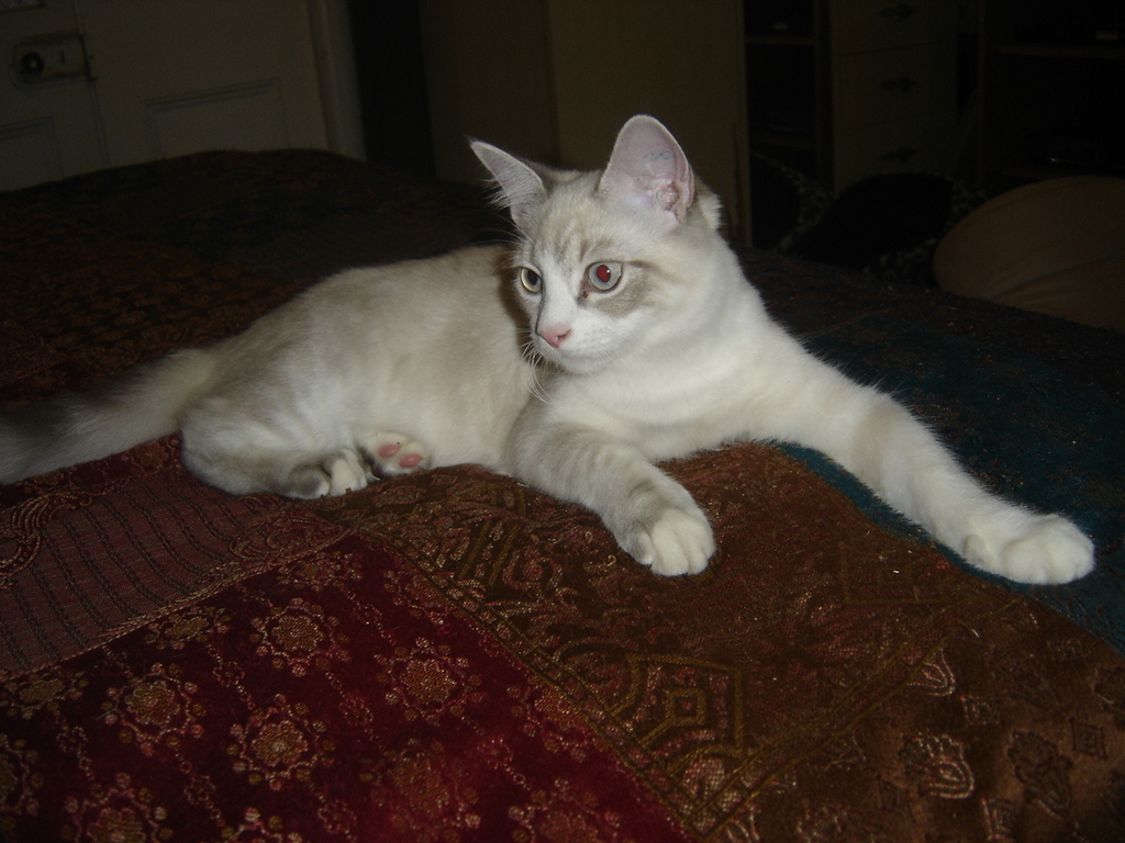 I am a sensitive soul who needs lots of love and affection. I love to be cuddled and have my belly rubbed. I will follow you everywhere in the house just to be near you. I also like to play and make little chirping noises when I'm having fun. I'm fond of lying on the pillow beside your face at night so you shouldn't let me sleep with babies or small children because I could accidentally smother them. I will knead your neck but it is more like acupuncture than a massage because of my prickly little claws. I don't like to be alone so would be happiest if you have another cat to keep me company while you are at work. I get along very well with other cats. I'm OK with small dogs but hesitant with big dogs until I get to know them. It's best for me to be an indoor only cat because I wouldn't survive the outdoors with my delicate skin and gentle nature. I am so adorable that my foster carer doesn't want to part with me but she can't keep me so I'm looking for a new home and someone to love me. I look forward to meeting my new family.