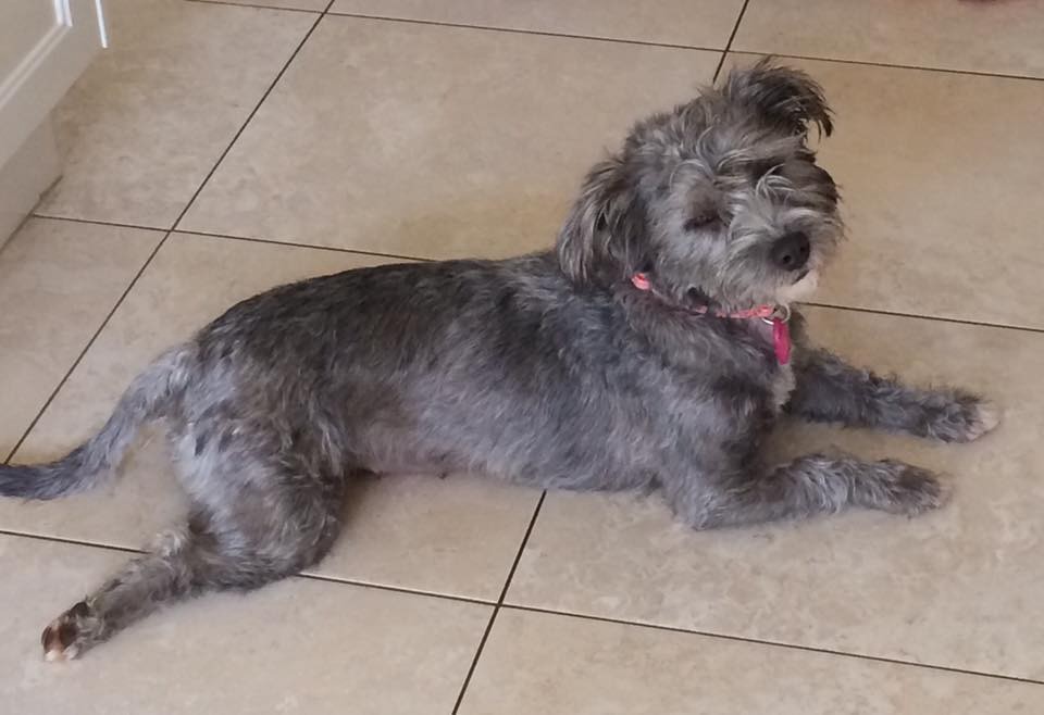 Pepper is a beautiful young lady who is a pretty grey colour with a white chest. She is about 12 kg and a medium size dog, rather than a small dog. Her coat is quite soft and will grow longer requiring regular grooming to keep her looking her best.