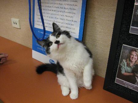 Nemo is delightful domestic medium - long hair black and white kitten. He was bought into the stud park veterinary hospital and surrendered by his previous owners as they could not afford a pet. He has beautiful markings with a black spot on his nose resembling charlie chaplin!