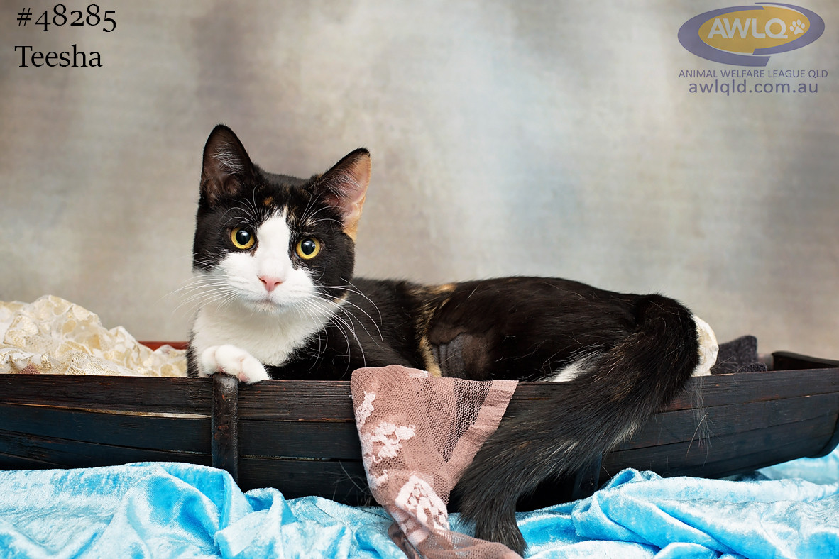 Teesha is an adorable little tuxedo girl who loves a cuddle and will greet you with head butts and kisses. She's quite independent but does like to be near you especially when you're telling her how beautiful she is.