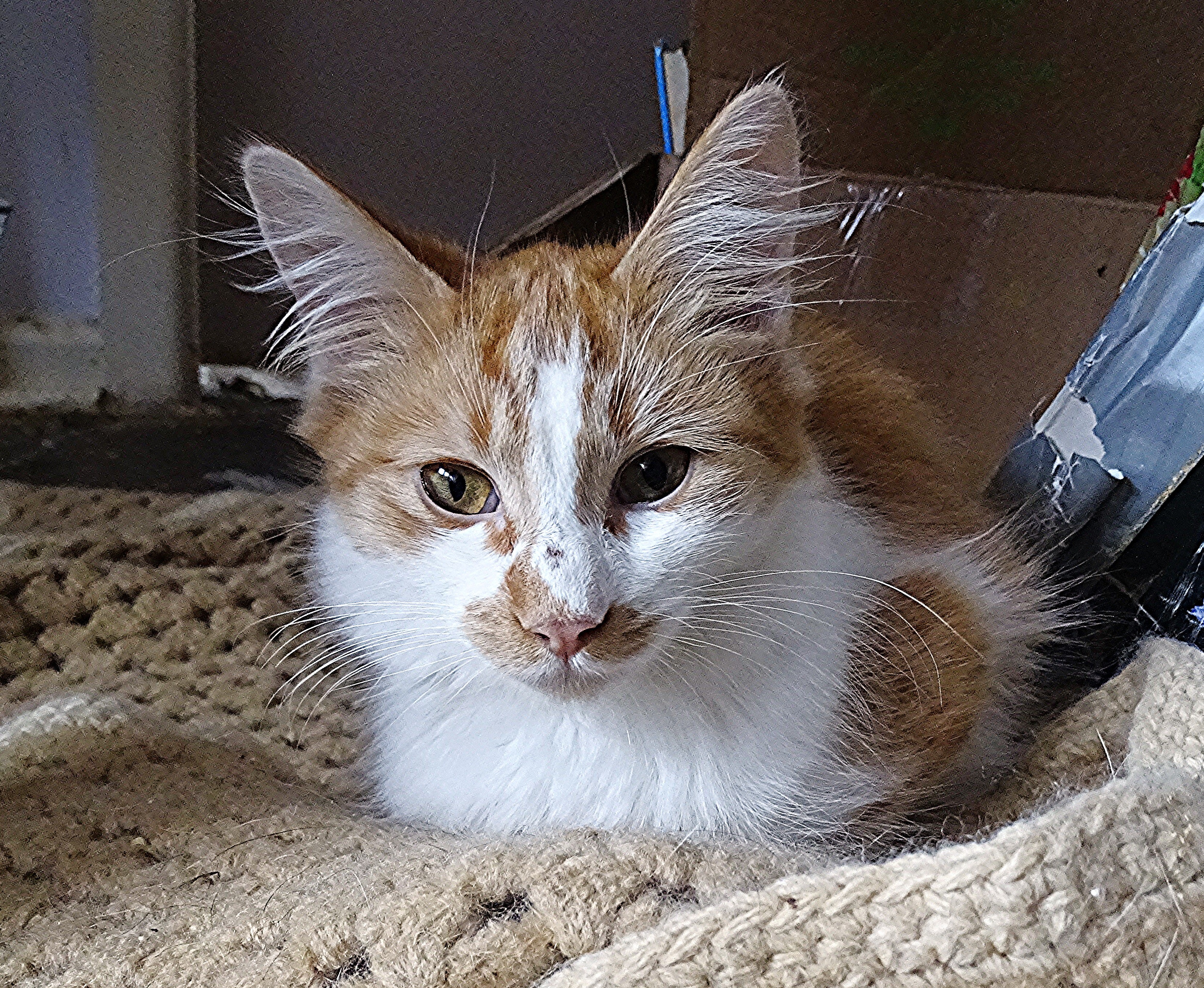 Due to her light colored nose, care must be taken if she is allowed outside as she could suffer sunburn.