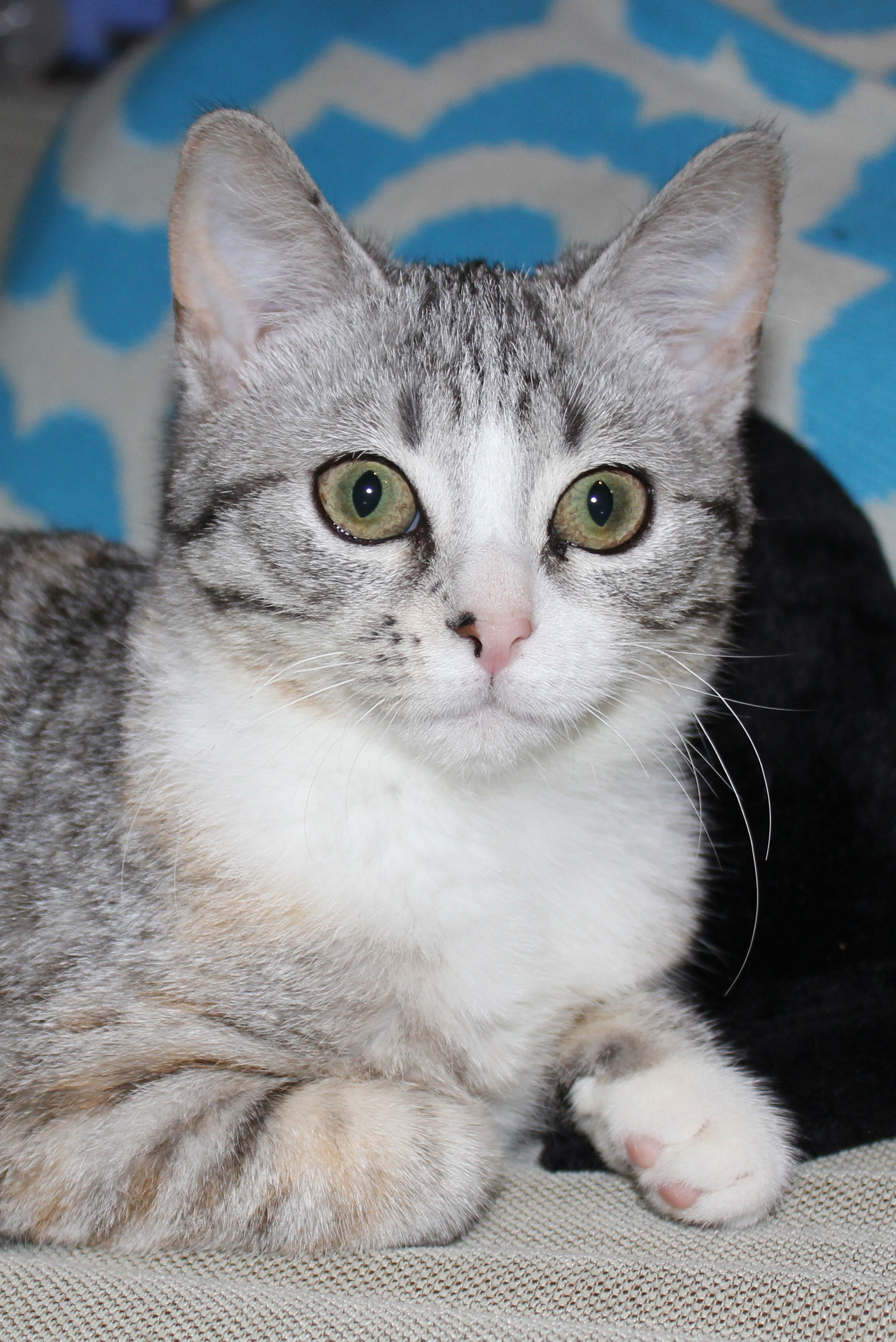 Silvie (we call her Silvie Bug) is a gorgeous little girl. Loves everyone she meets, human or animal. She is very cuddly and affectionate, always looking for hugs. :) Silvie is a gentle kitten that isn't very vocal, she is used to being indoors and would make the perfect lap kitty.