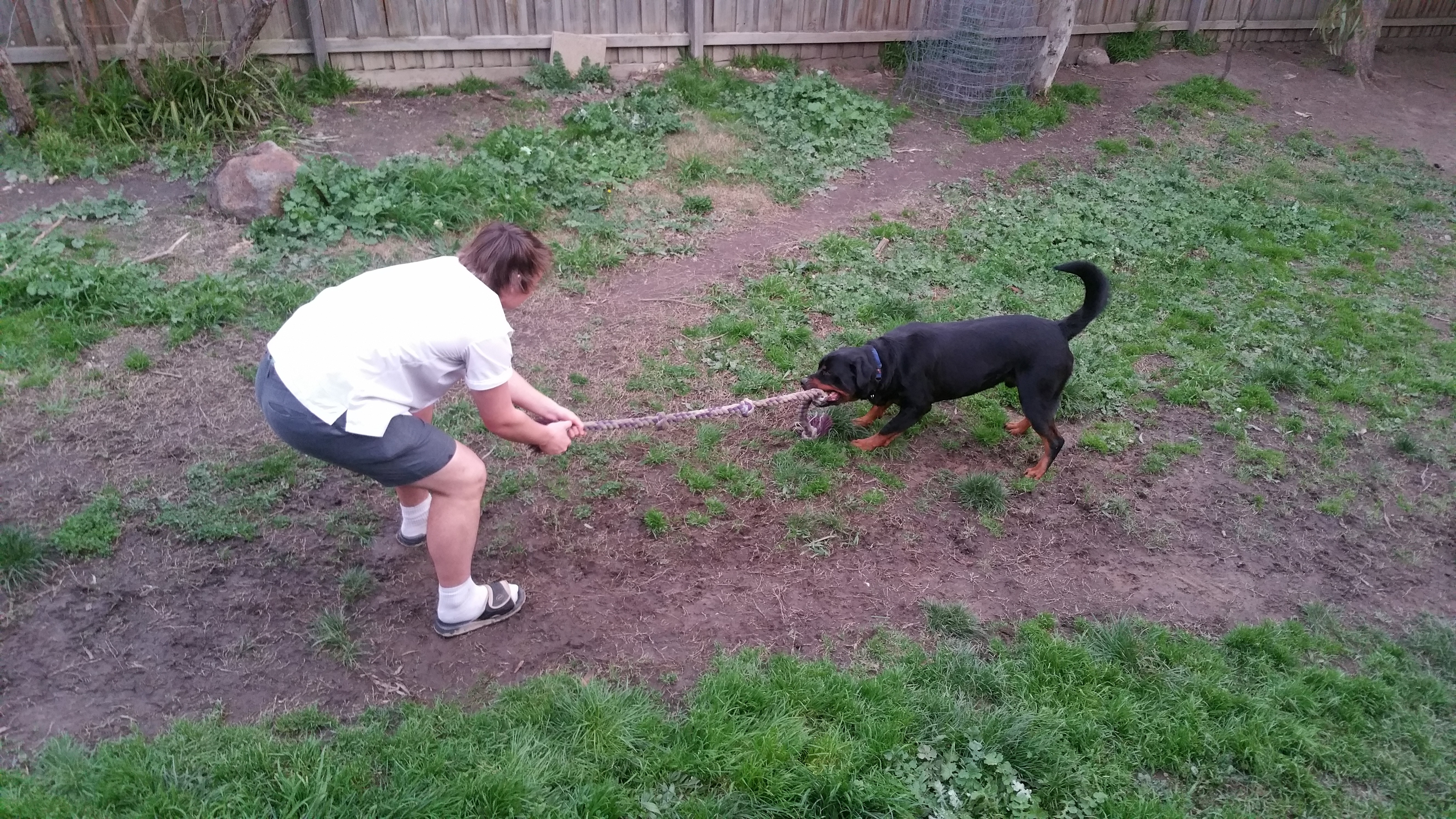 Hugo is a large Rottie and weighting approximately 50kgs his over excitement and jumping up was particularly problematic as you can imagine, he is learning not to do it but this will need to be continued in his new home and at the moment is DEFINITELY NOT suited to a family with small children (unless a strong commitment to training and understanding can be demonstrated) as he will unintentionally knock them off their feet and probably jump on them for kisses - hurting them.