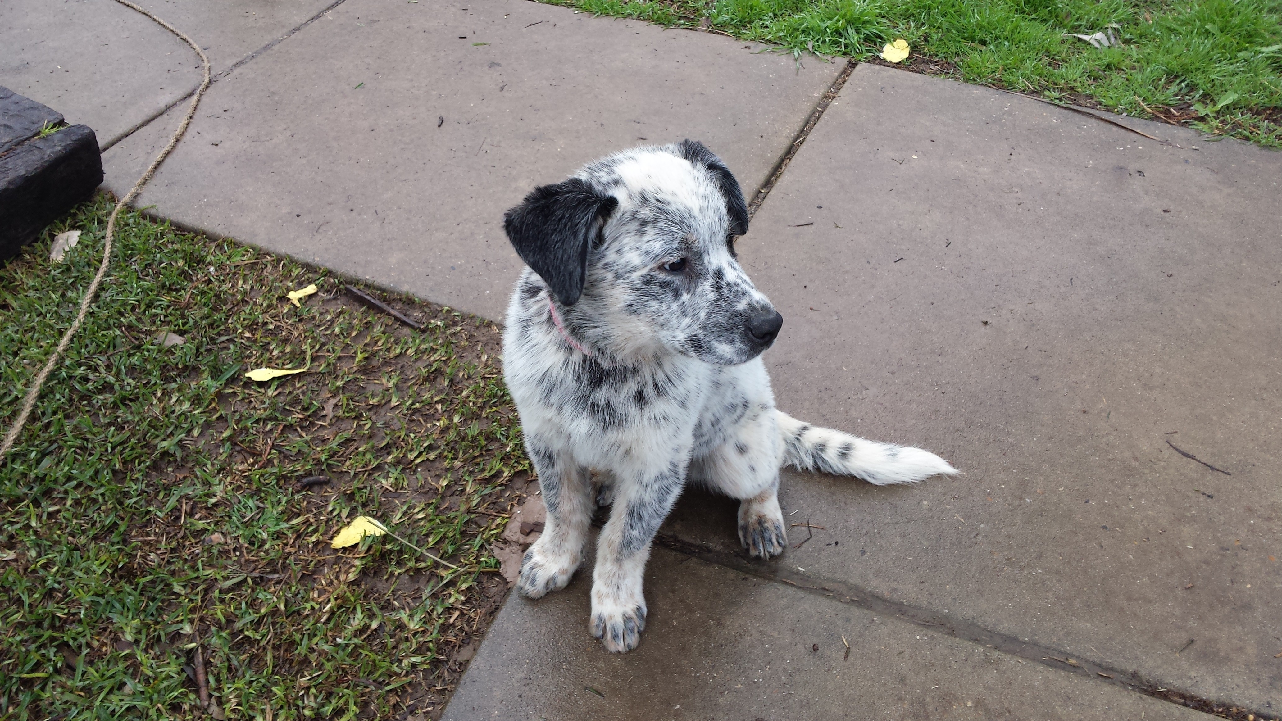 Buster is a big puppy bursting with glee to see his human friends. He watches at the back door intently and bounces enthusiastically when his friends come to play. He is a big puppy at four months but still very fluffy. His colouring is very interesting, complete with eye patch and what looks like blue and red heeler mix. We were told that the parents were heeler and kelpie.