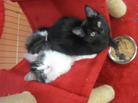 Adam is a confident, loving and talkative kitten who is great with cats and dogs. He loves jumping into bed with you and snuggling up. The photo shows him with his tabby and white brother, jerry