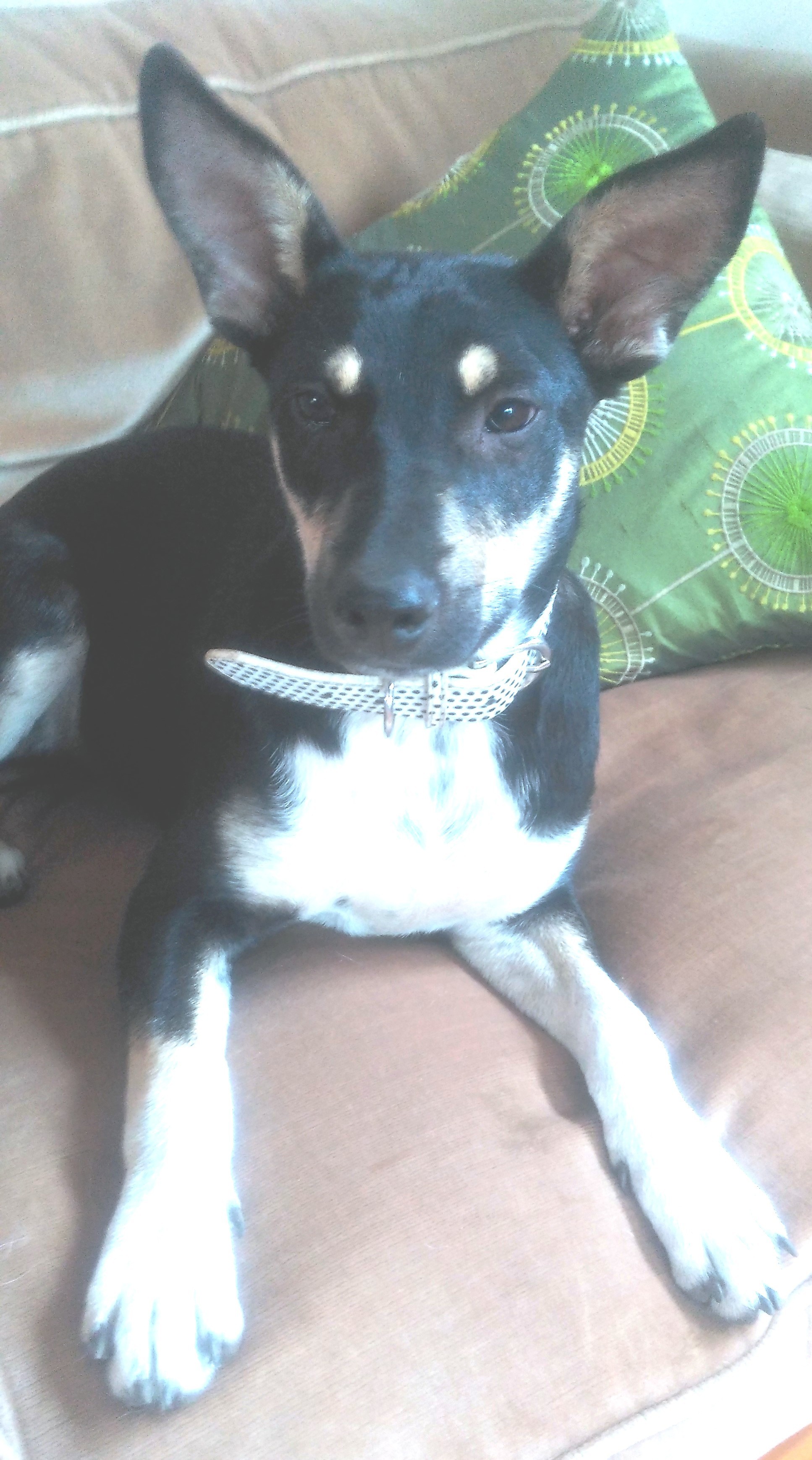 We have no idea of her breed or who her parents were. She has markings and pointy ears of a kelpie and was born was a short tail but It is highly unlikely her parents were ever working dogs.