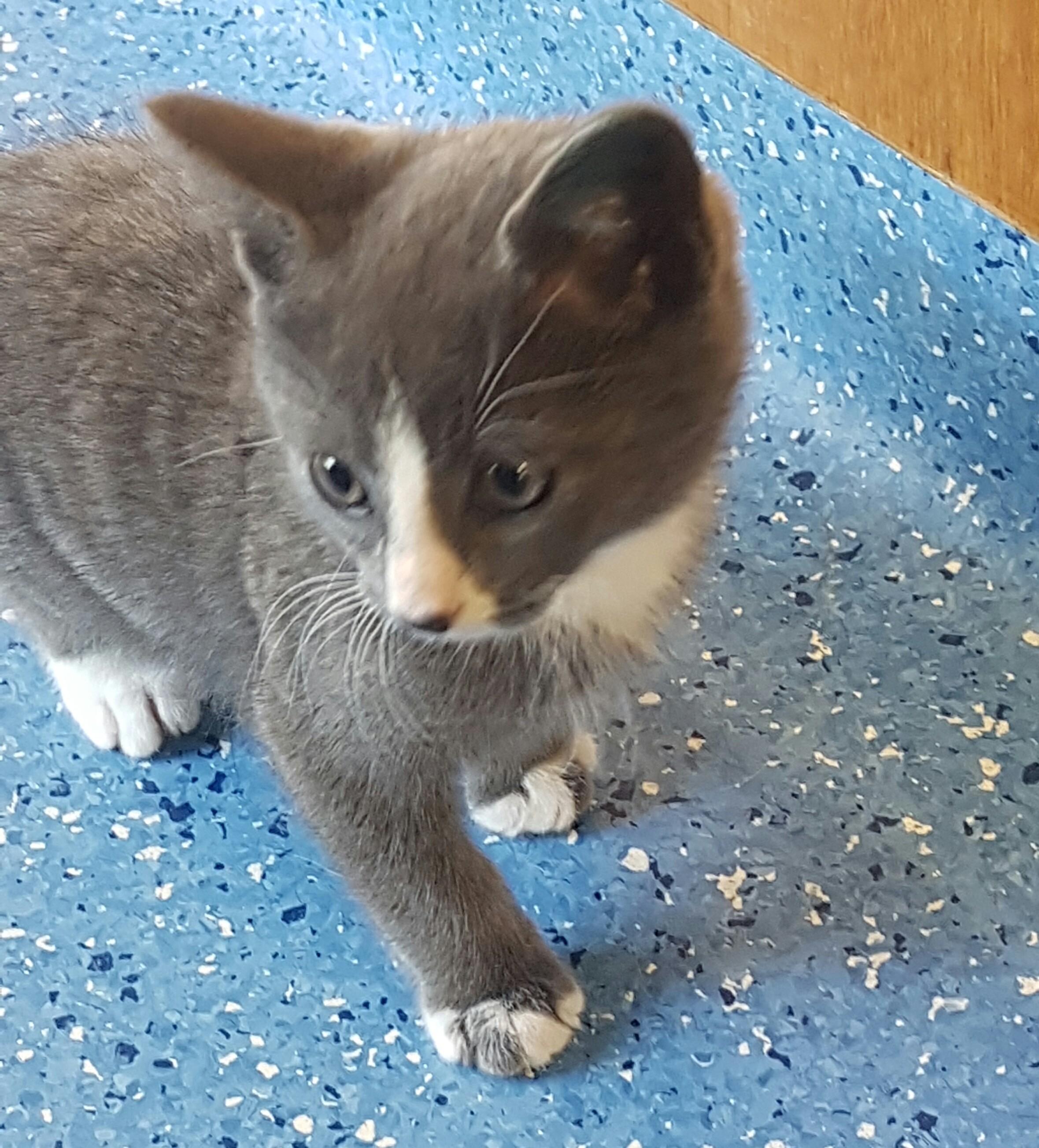 I am a 7 week old grey and white kitten. I am great with both kids and adults.I love attention and to play with my toys. I am very affectionate and will cuddle you to death. I love being around people whenever I can.