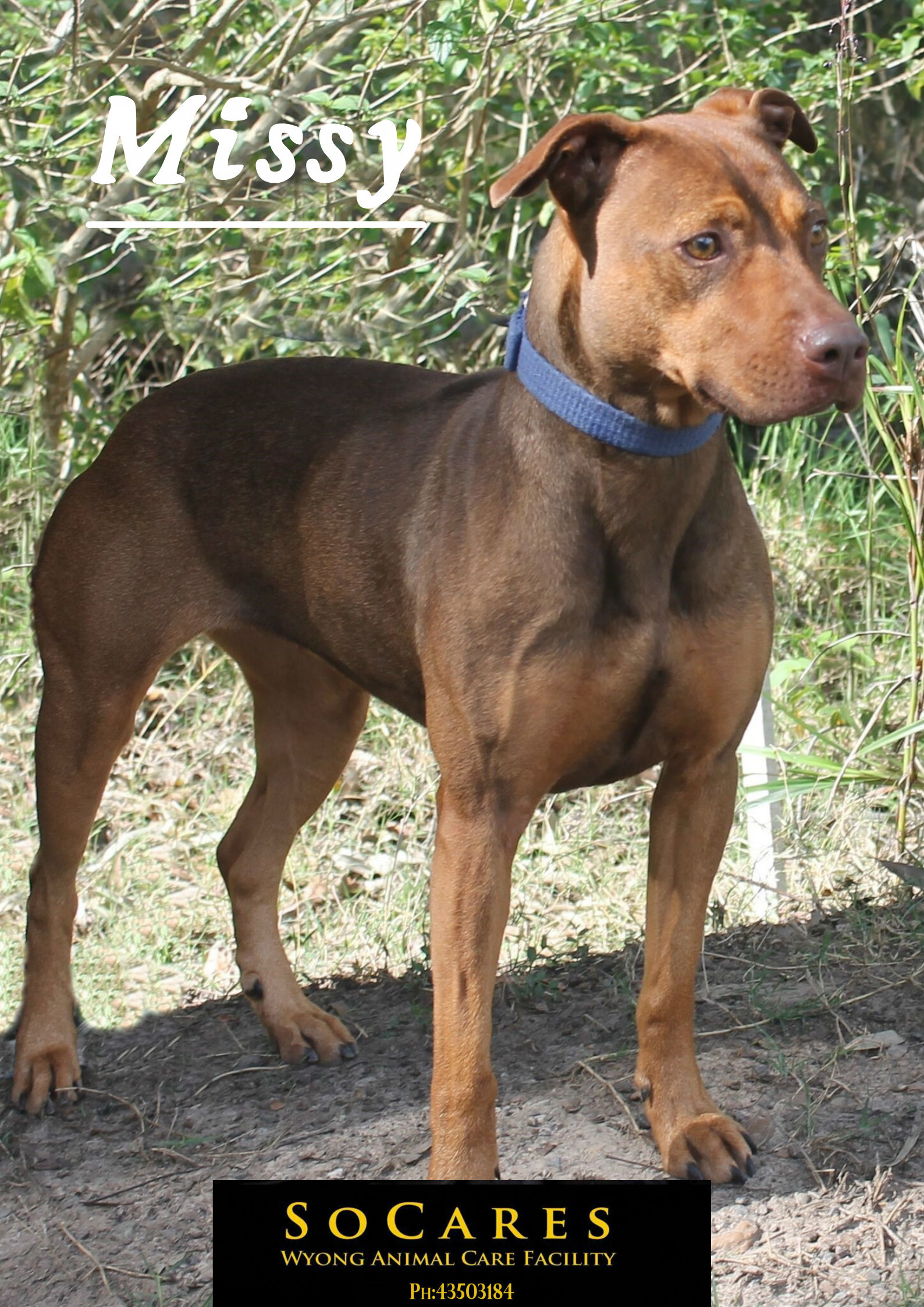Missy is a sweet and loving girl who will be best suited to a family who will give her a life full of play time, walks/runs, toys and affection. This little miss is happy to learn so she would also benefit from obedience training. Missy is great with people, but can be a little selective of who her canine friends are at times. She is terrified of cats, if they hiss at her she knows to stay clear. If you would like to meet Missy please come into the facility during opening hours.