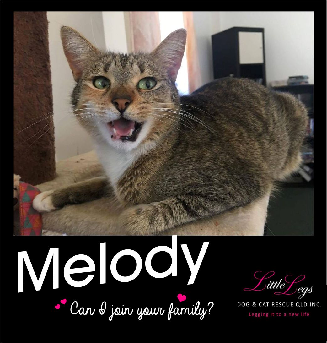 Hello! My name is Melody and I love people, pats, watching birds through the window and long cuddles on the couch.