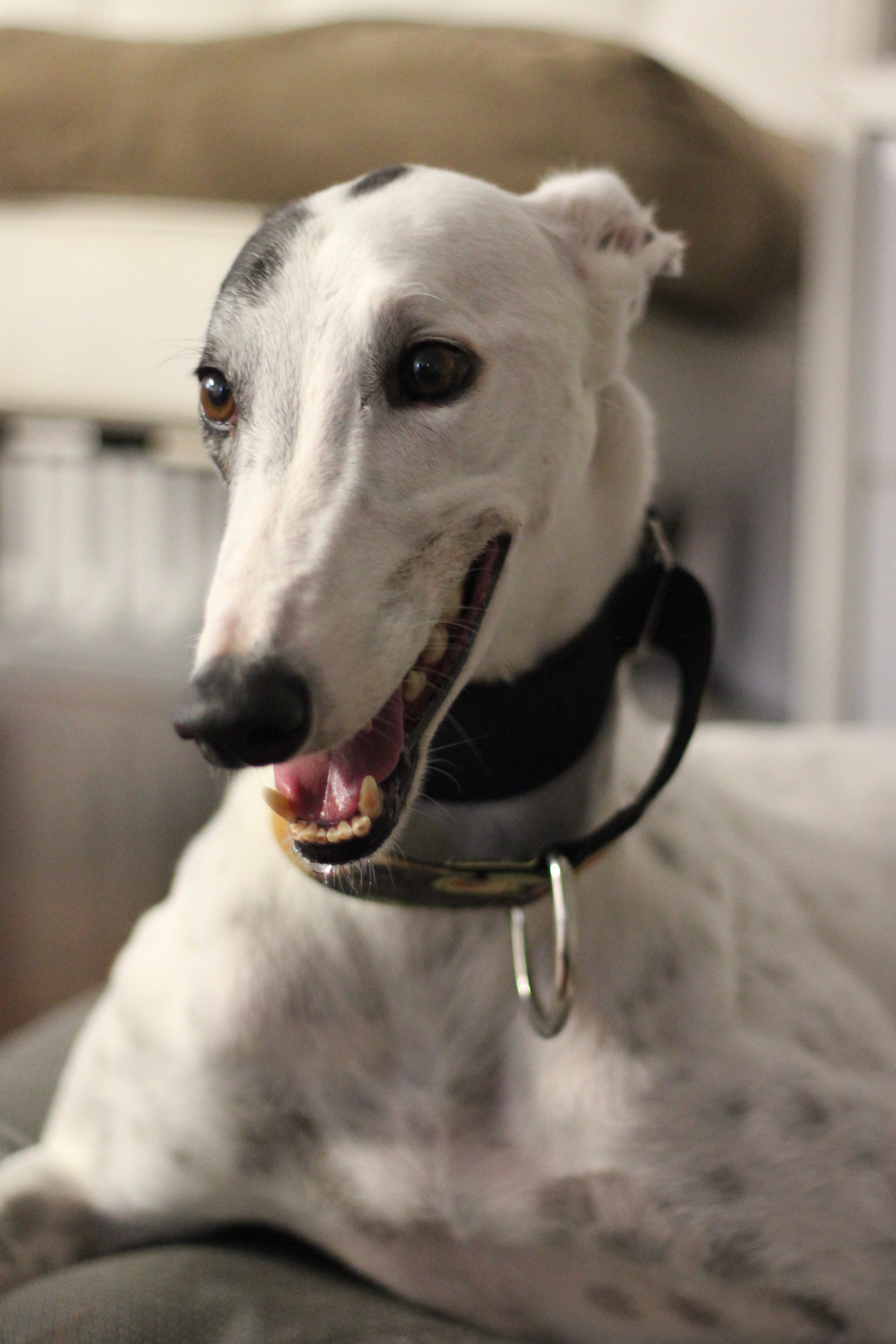 Snowy likes company and will need a home with a canine companion. He’s most confident when he’s with his greyhound foster sisters, and frets if he’s left by himself. Snowy has mastered going down stairs, but is still working on getting up them! He’s a little too excited by cats and small dogs, so it is best that he only lives with medium to large-sized dogs. He doesn’t seem to mind having children around (six or over).