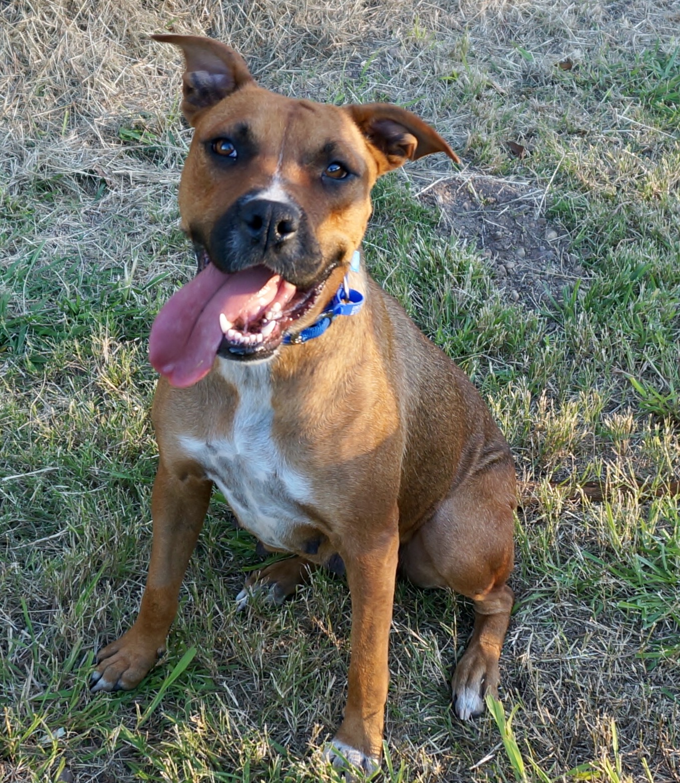 Ruby's foster carer believes that with her sweet personality she would be good with older children who are confident with young and bouncey dogs. She has a short smooth coat that is easy to maintain with a quick bath and occasional brushing.