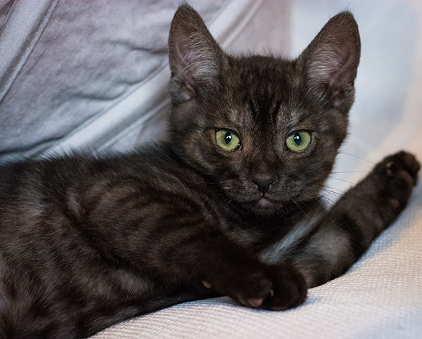 Ash is the sweetest little thing. Her brother Sooty and her look like twins, but Ash has the gentler personality. Don’t be fooled, she takes every opportunity to pounce on her brother and start a game of chase and loves nothing more than high speed ball batting and toy mouse chasing, but she is always the first to come over for cuddle or to find the best spot in the sun for a cat nap.