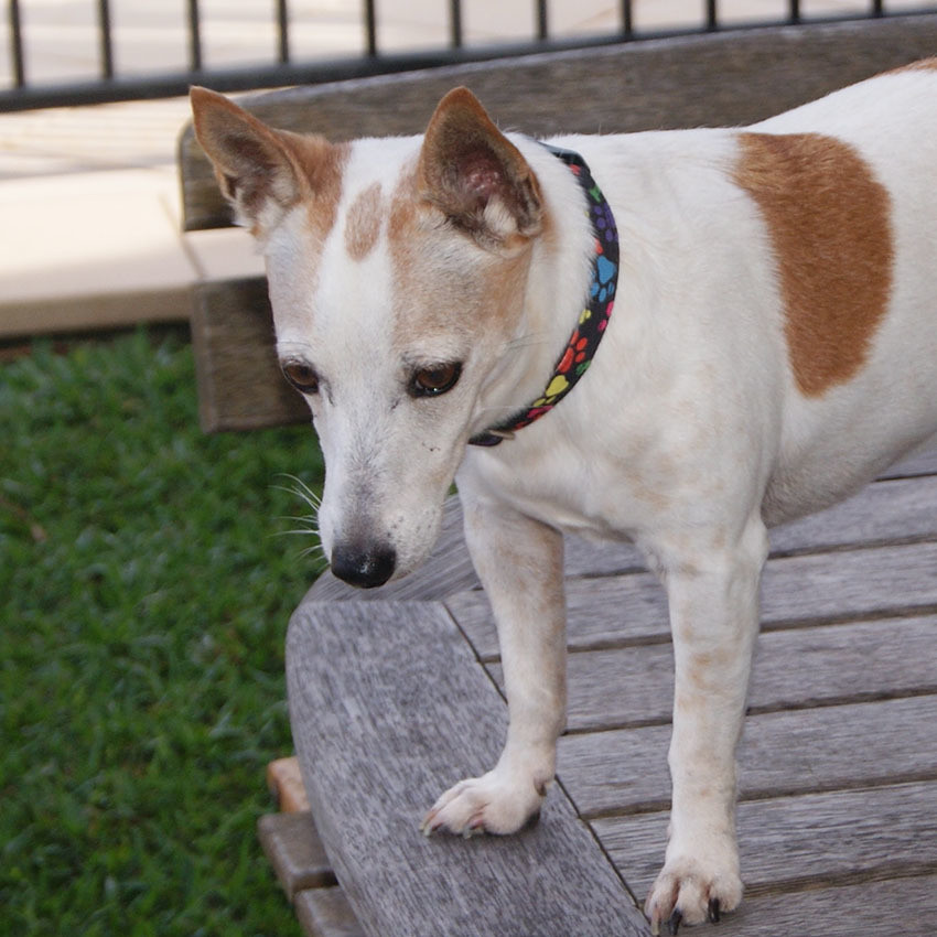Roxie is a sweet 9 year old Fox Terrier x girl. From her appearance, perhaps she may have some Jack Russell as well. Her colouring is white with a few tan spots – typical of this breed. She is compact and muscular in appearance, sharp and alert and possesses a ton of energy. She weighs around 5.8 kgs and stands 30 cms at the shoulders. She also measures around 30 cms from chest to rump.
