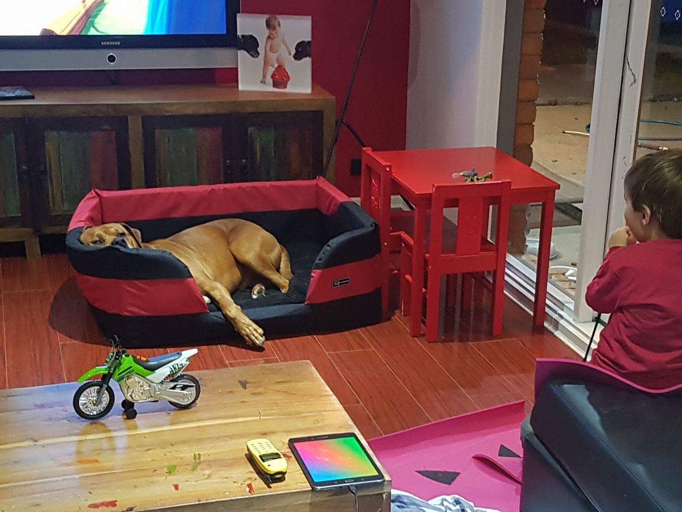 Teddy is a very obedient boy, he can "sit", "down", "give paw", "stay", "come" and "go to bed" and is fully toilet trained. Teddy is very gentle with his human foster brother who is just 3 years old.