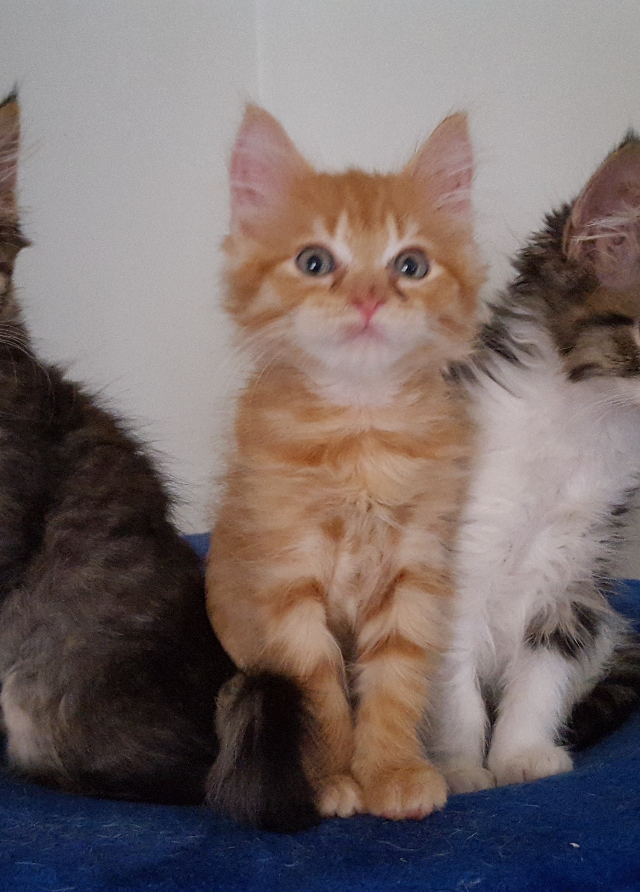 Ninj is a curious and sweet little guy. He loves exploring and finding new places to play in. He will give you lots of love and plenty of crazy kitten antics. He loves ping pong balls, feathers, toy mice, squeaky rolling balls, boxes - they're a toy and a bed!, rumbling, grabbing his brothers and sisters tails. Blankets are a lot of fun too!