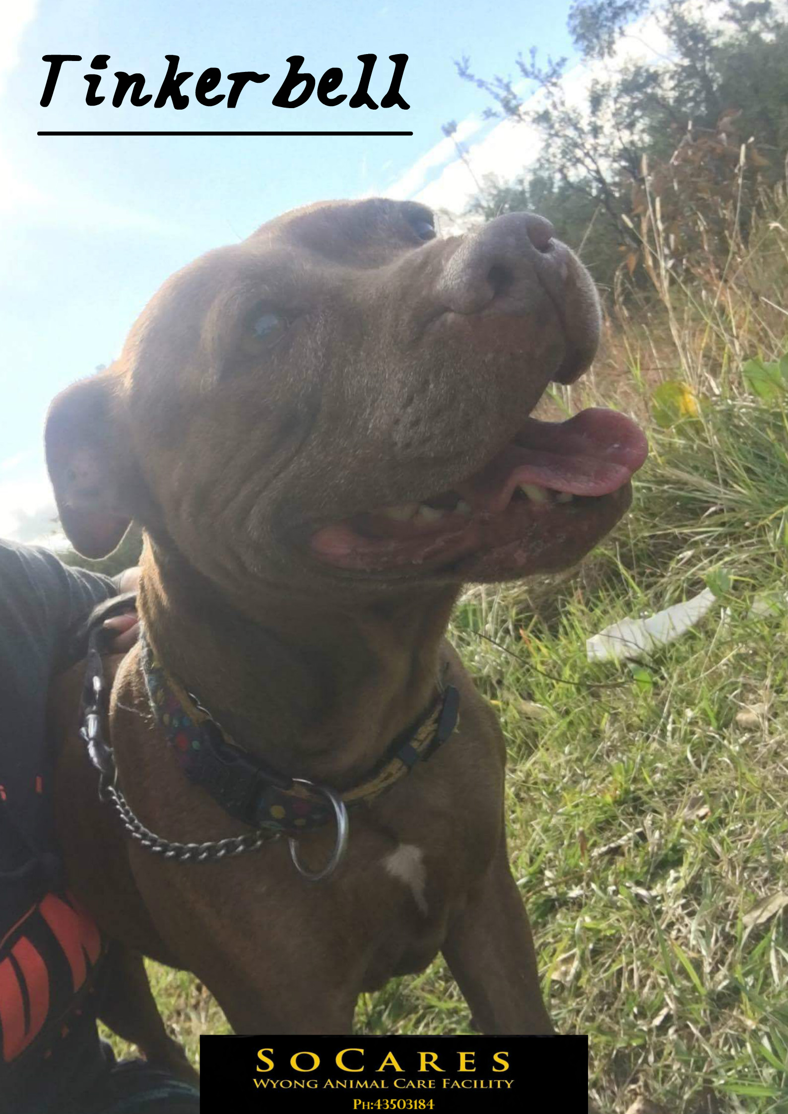 Tinkerbell has an adorable grey muzzle and is an absolute sweet heart. She loves cuddles and human company. Tinkerbell is well behaved when she is on her walks and she would be a great companion for someone needing a furry friend. Tinkerbell is non-reactive to her pound buddies and appears to be dog social.